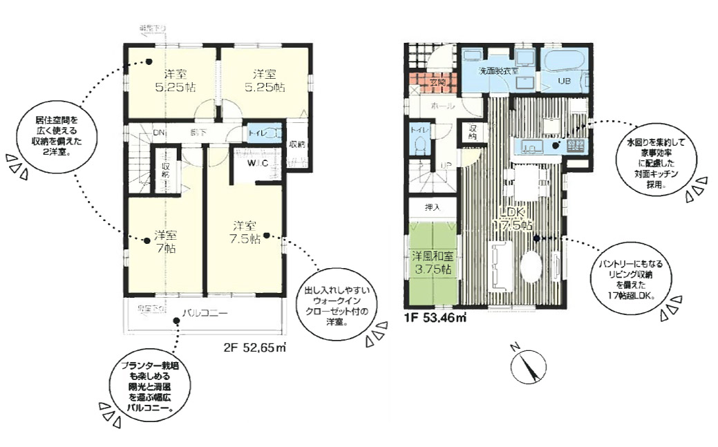 全19棟の大型開発分譲地。17号棟は、敷地約36.3坪。車2台並列に駐車可能です。延床面積102.06㎡。全室南向き。全室6.5帖以上のゆとりの3LDK。LDKは、広々20.75帖あり、キッチンサイドにパントリースペースがあります。バルコニーは2面あり、奥行きの広いワイドタイプです。