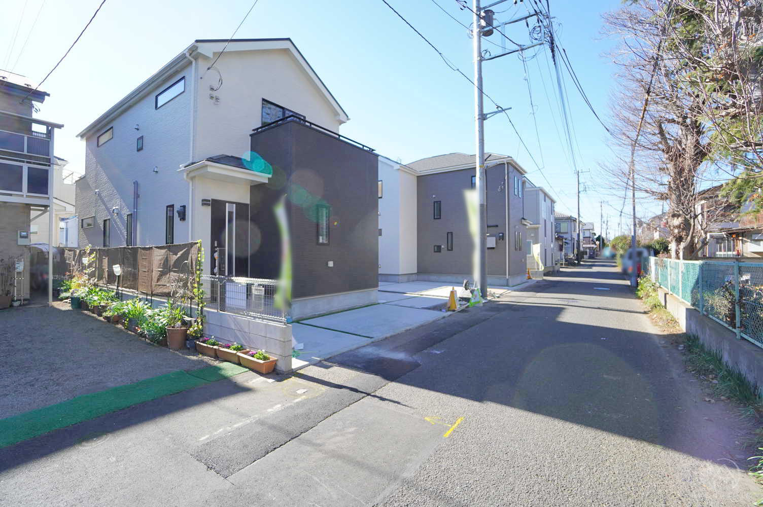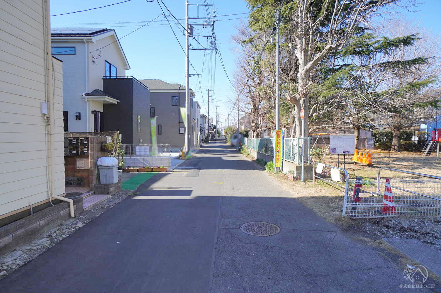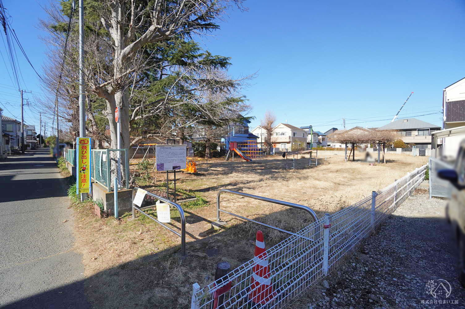 通りから入った落ち着きある住宅街です。道路向かいが公園のため開放感があります。