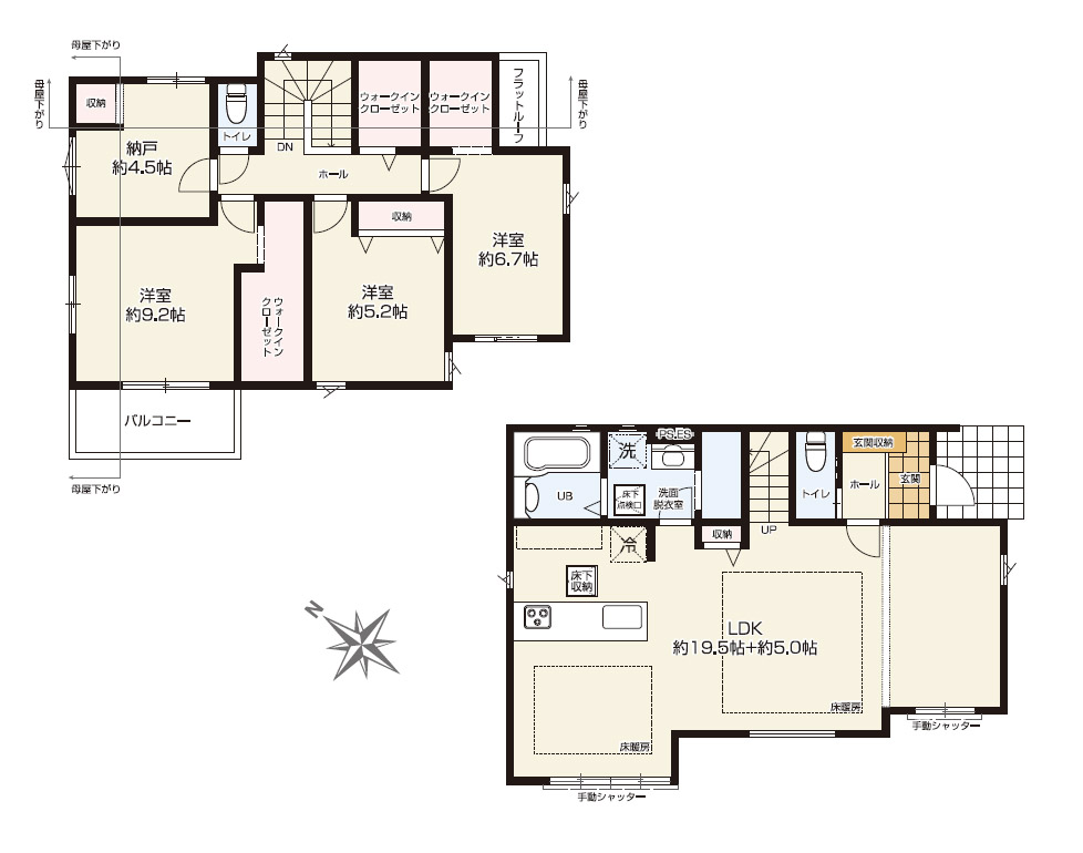 清瀬駅 徒歩9分。新築戸建 全6棟。2号棟は、南東向き。南西側が隣地通路のため陽当たり良好です。車2台並列に駐車可能です。延床面積113.26㎡。2Fに4居室あるゆとりの4SLDK相当の間取りです。LDKは、約23.2帖の広々空間です。2F主寝室と廊下に大型のウォークインクローゼットを完備。