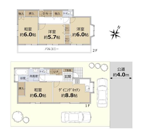 閑静な住宅街です。敷地約31.2坪の整形地。車2台駐車可能です。全室南向きの4DKの間取り。