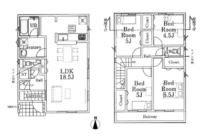 令和5年築の築浅戸建。南側隣地が駐車場。東側が隣地の庭先で建物などなく、間口が狭めの敷地ですが、開放感があり陽当たり良好です。2Fに4居室ある4LDKの間取り。LDKは広々18.5帖あります。リビングルームが見渡せるカウンターキッチン。一坪タイプの広々バスルームなど。