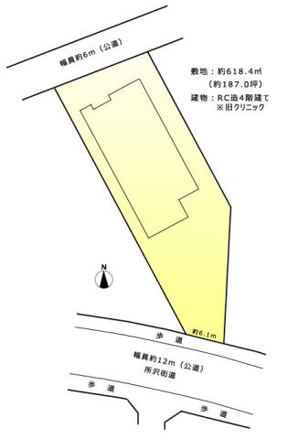 敷地約187坪の大型地。街道沿いの立地です。両面道路で北側も公道に接道しています。4F建ての建物(旧クリニック)が建っています。